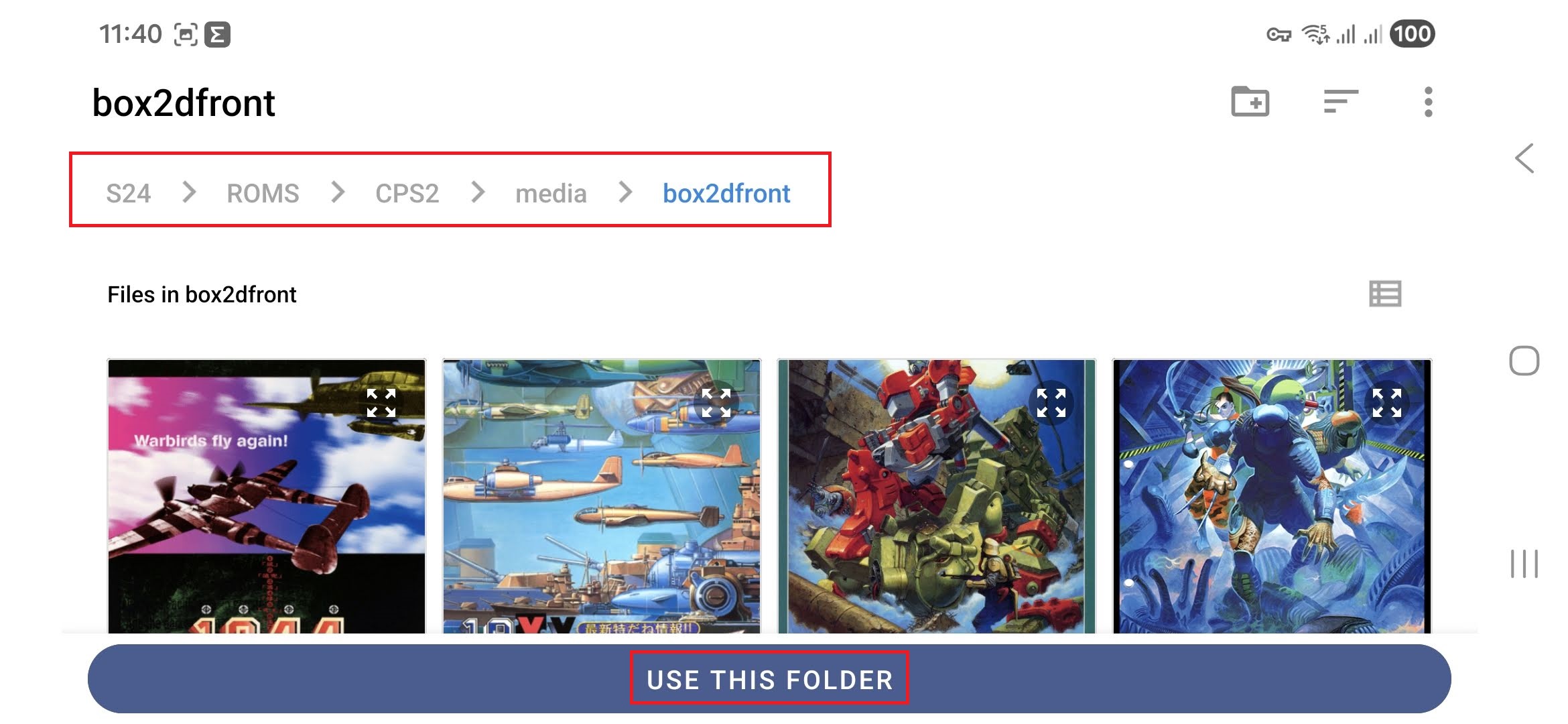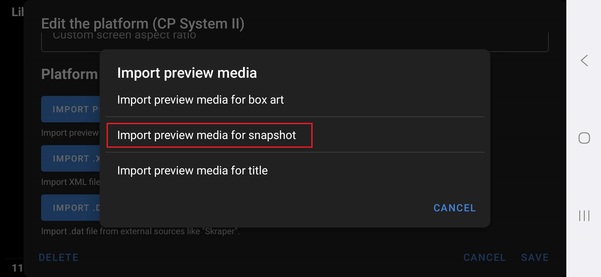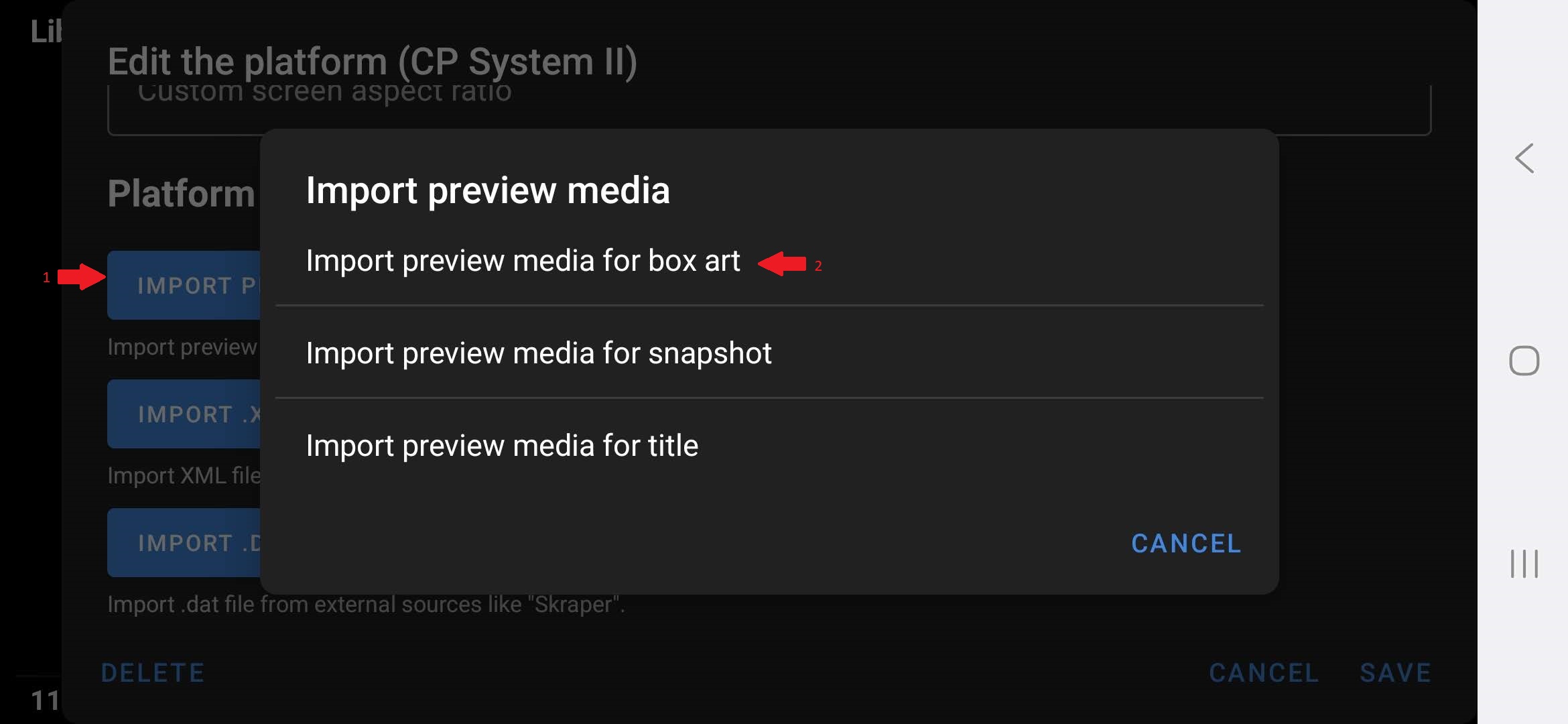 Tap on “Import Preview Media”, browse for the correct folder under that system and the “box2dfront” subfolder.