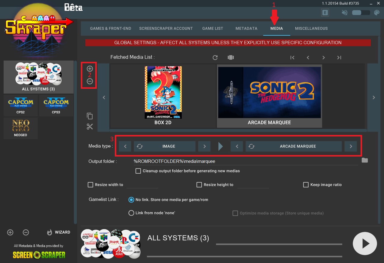 First click on “Media”, then remove all the existing items by clicking on the “-” sign, then add only one item on the “+” sign and under “Media type” select “Image” on the left and “Box 2D” on the right. Click the “+” sign and this time select “Image” in the first box, and “Arcade Marquee” in the second.