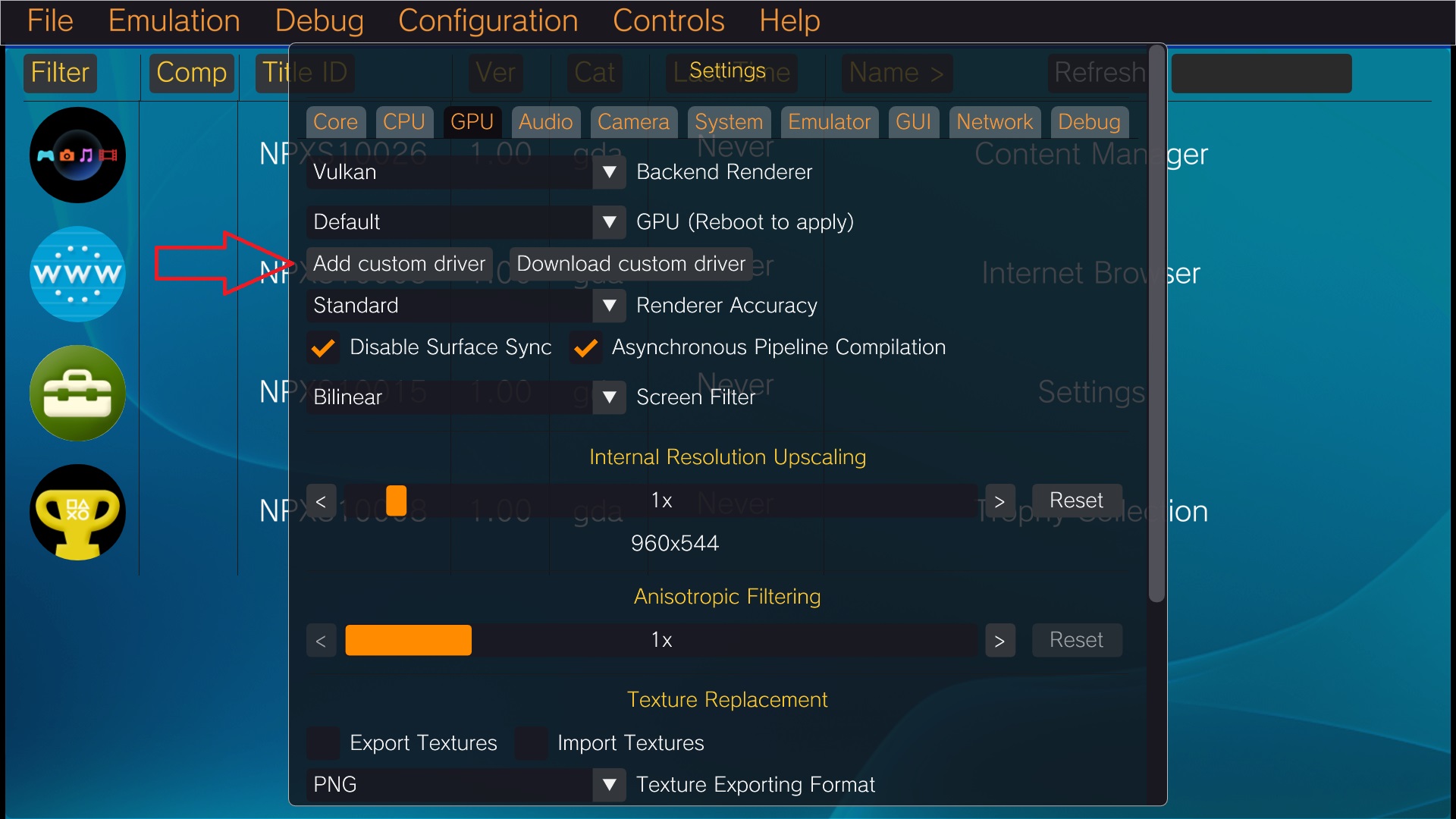 Configuration > Settings > GPU > Add custom driver