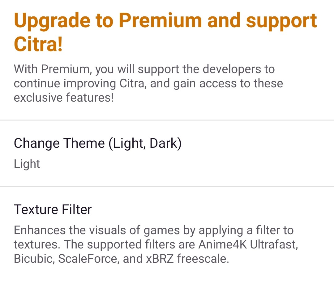 Over 90% of all the features in Citra are free. You can load games, play them, save your states, tweak the settings etc. Once you tested your favorite games and wish to support the developers, you can unlock the premium version for 4.99$ from within the app. This will also unlock the dark theme (crucial to OLED users), as well as some advanced texture filters. Just remember that Citra for Android is still in beta and might be in beta for a long time.